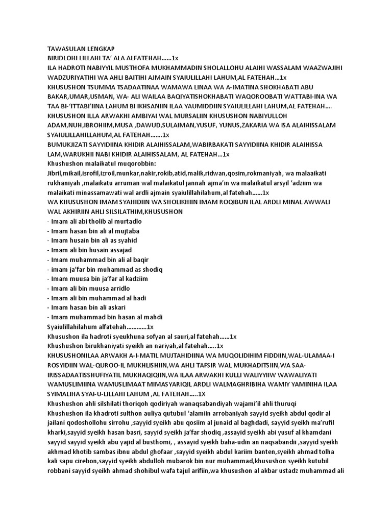 Tawassul Lengkap : Bacaan Tawasul Tahlil Lengkap Pdf Lasopamaster / Syeikh abdul qadir jilani (futuhal ghaib 6) syeikh abdul qadir jilani (futuhal ghaib 5) syeikh abdul qadir jilani (futuhal ghaib 4) syeikh abdul qadir jilani (futuhal ghaib 3) syeikh abdul qadir jilani (futuhal ghaib 2) syeikh abdul qadir jilani (futuhal ghaib 1) snapfish (tanpa judul) keutamaan ( hikmah ) surat surat dalam al.. Ikhwan fillah yang sefaham dengan kami rohimakumullah. Terutama bagi kita yang bermazhab syafi'iyyah. Ilmu hikmah merupakan salah satu ilmu spiritual yang ditujukan untuk mendekatkan diri kepada allah melalui amalan, doa dan … Hadiah fatihah kepada rasulullah nabi muhammad s.a.w. 4.4 was updated on august 29, 2018.
